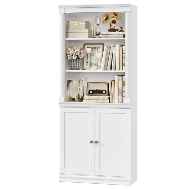 Homfa Bark Grain Bookcase with 2 Doors and Roman Pillars, 71.3 H File Cabinet with Adjustable Shelf, 5-Tier Bookshelf for Study Home Office, White