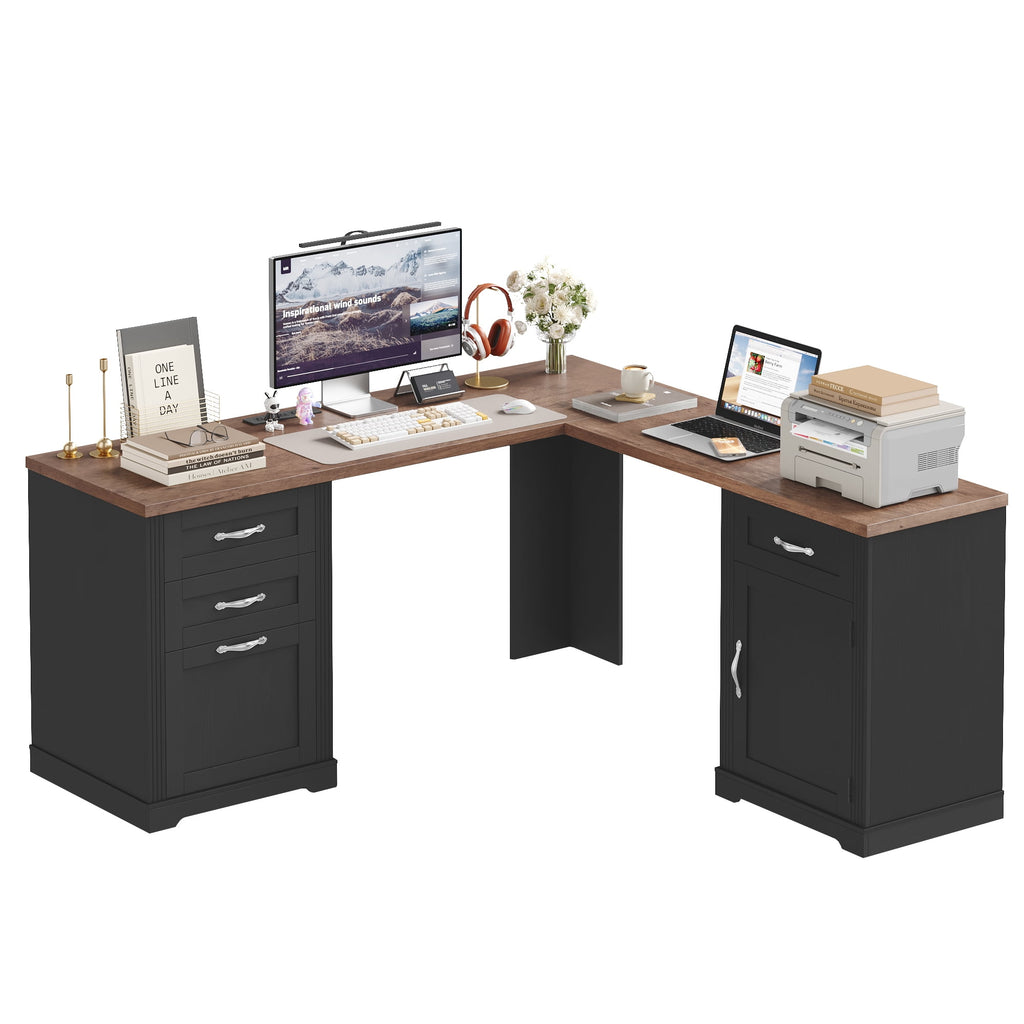 Homfa 59.8¡®¡¯W L-Shaped Computer Desk with 4 Drawers and Outlets, Modern White Study Writing Table Desk for Home Office£¬Black